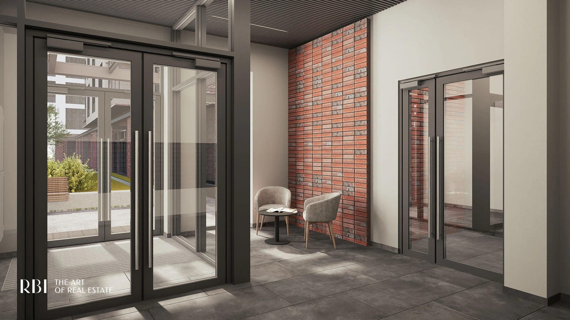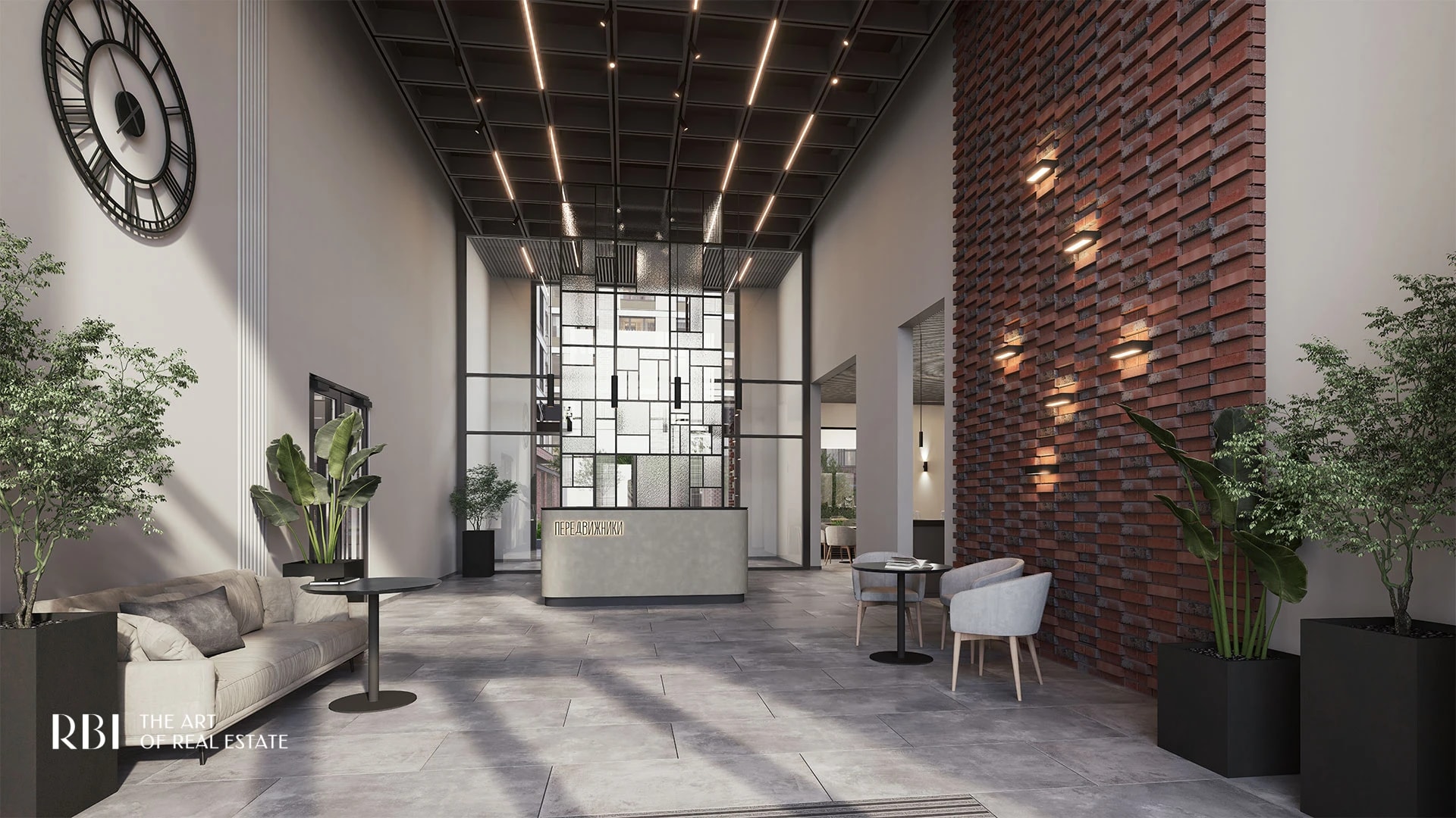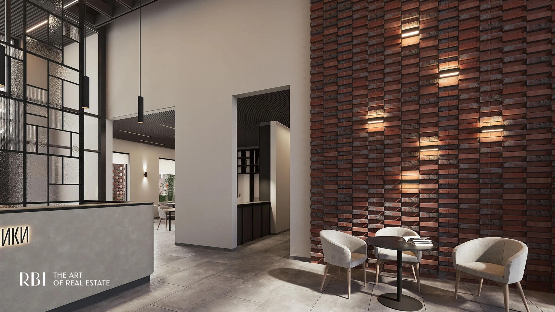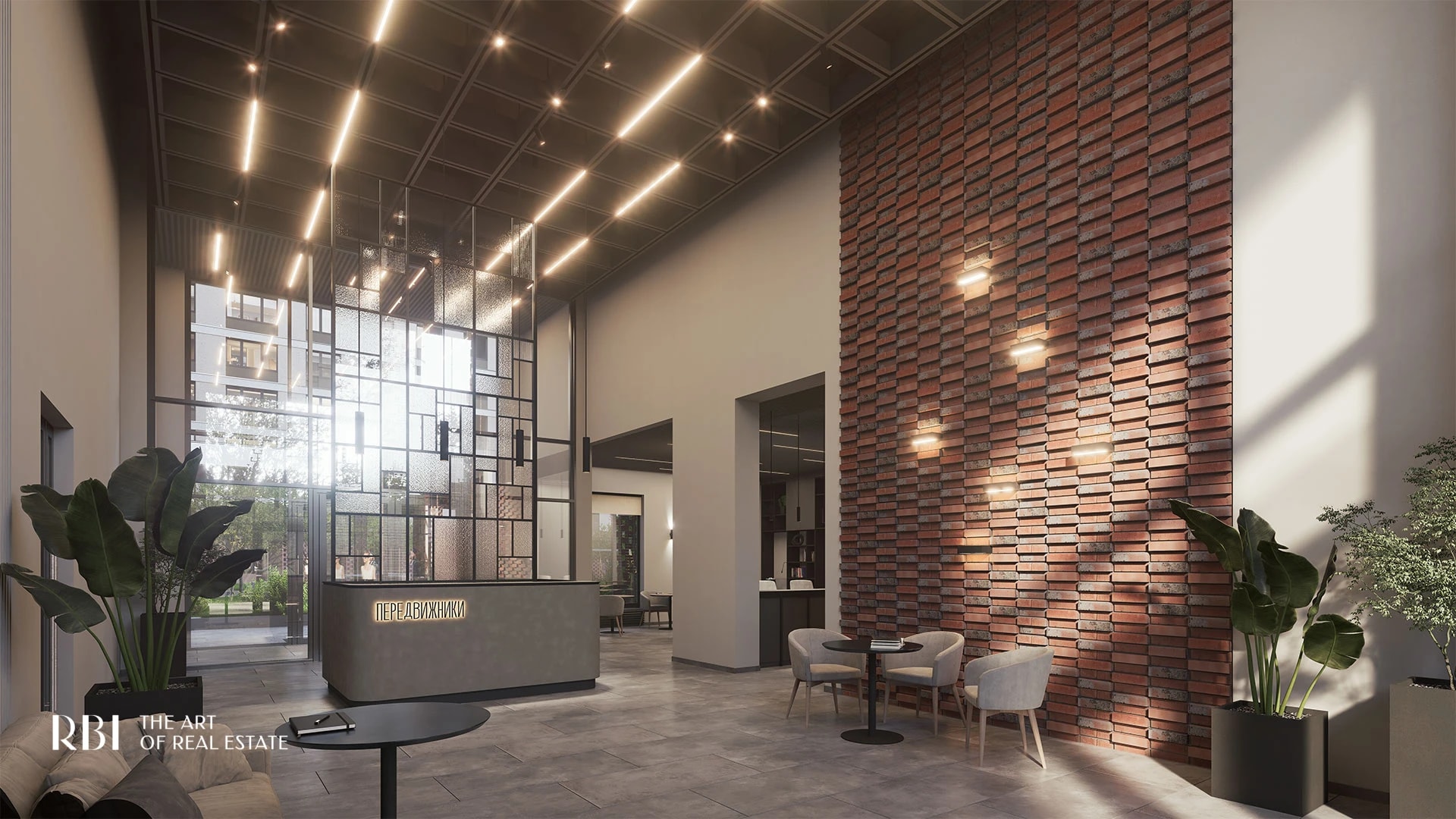 Лобби — это не просто входная группа, а современная светлая гостиная, которая задаёт эмоциональный тон всему дому. Панорамные витражи наполняют пространство естественным светом, создавая ощущение воздушности и простора. Дизайн подчёркивает тематику движения: линейные светильники, напоминающие рельсы, и фактурная кирпичная кладка продолжают мотив индустриального прошлого и архитектурную тему фасадов.