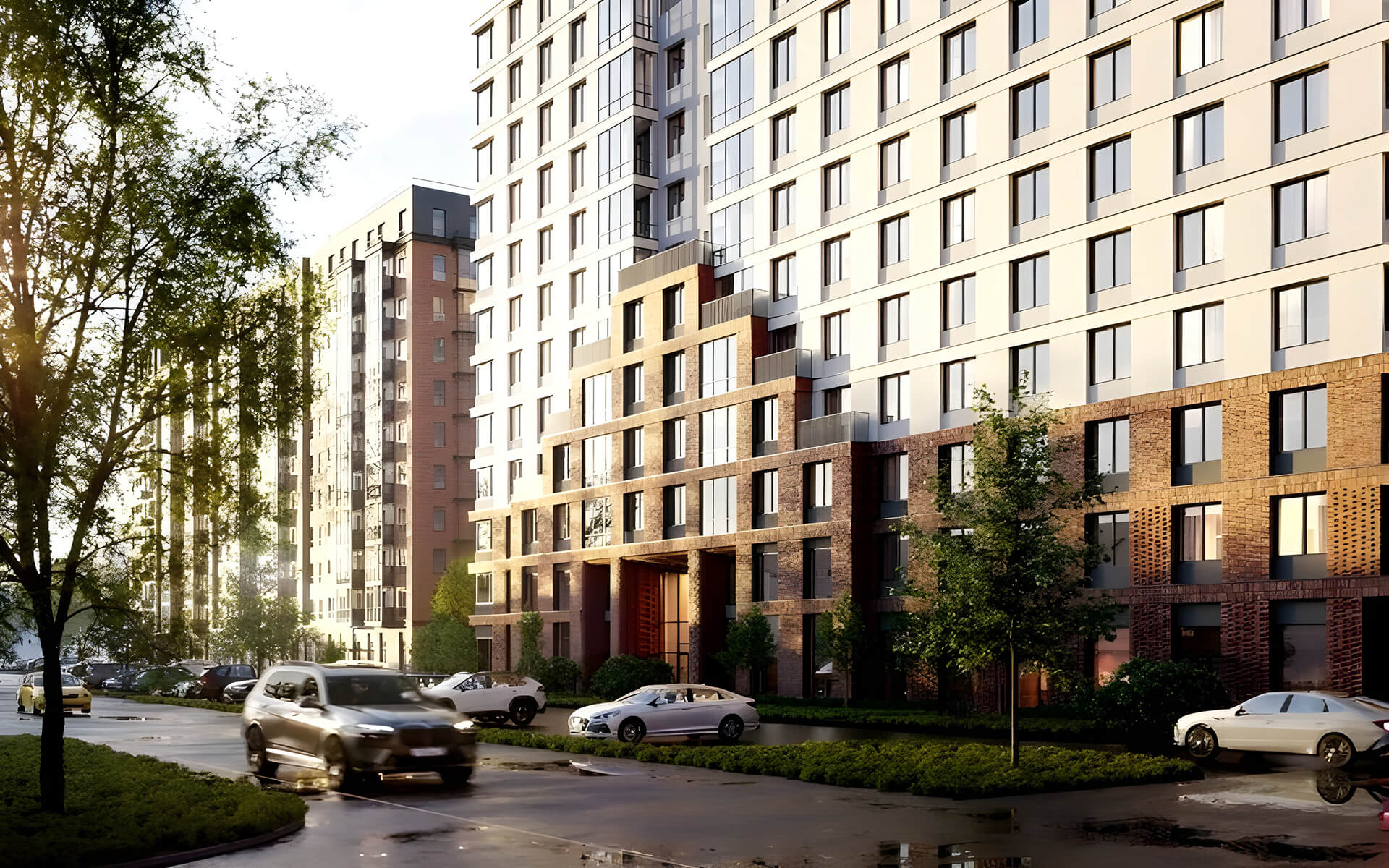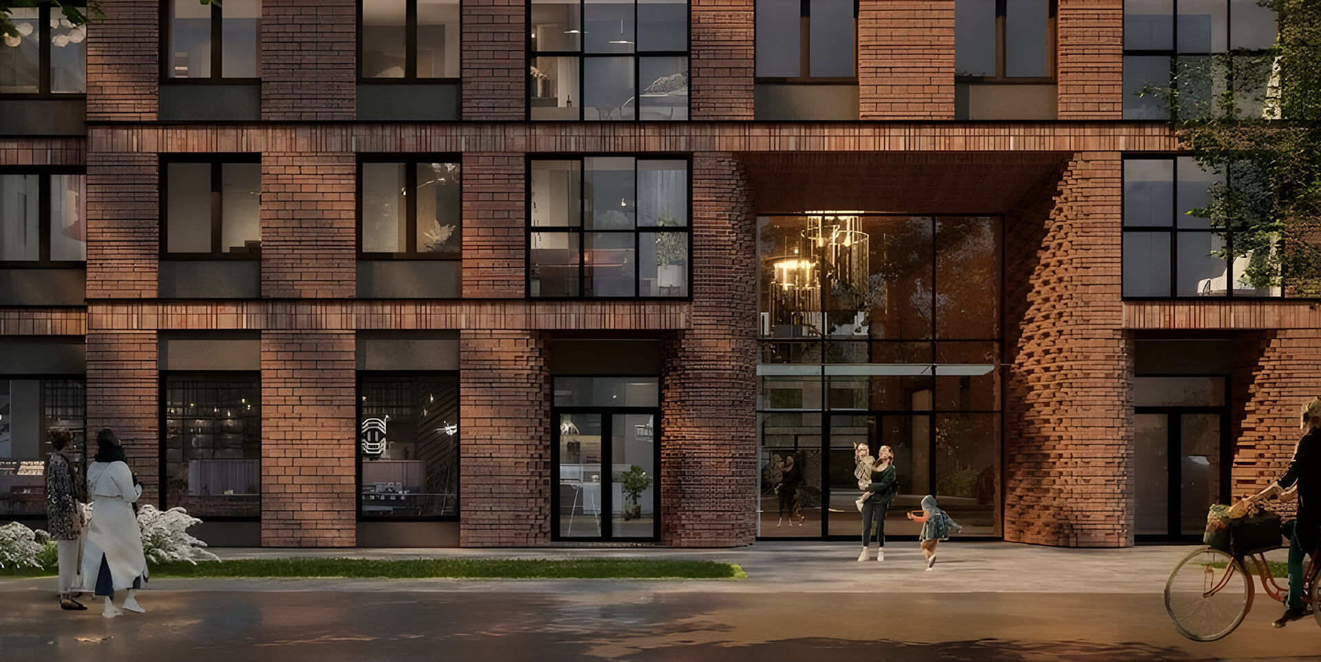 Контраст материалов — тёплого кирпича и светлой штукатурки — подчёркивает идею движения. 3D-кладка и вертикальные акценты создают живой ритм фасадов, превращая историю в энергию настоящего.
